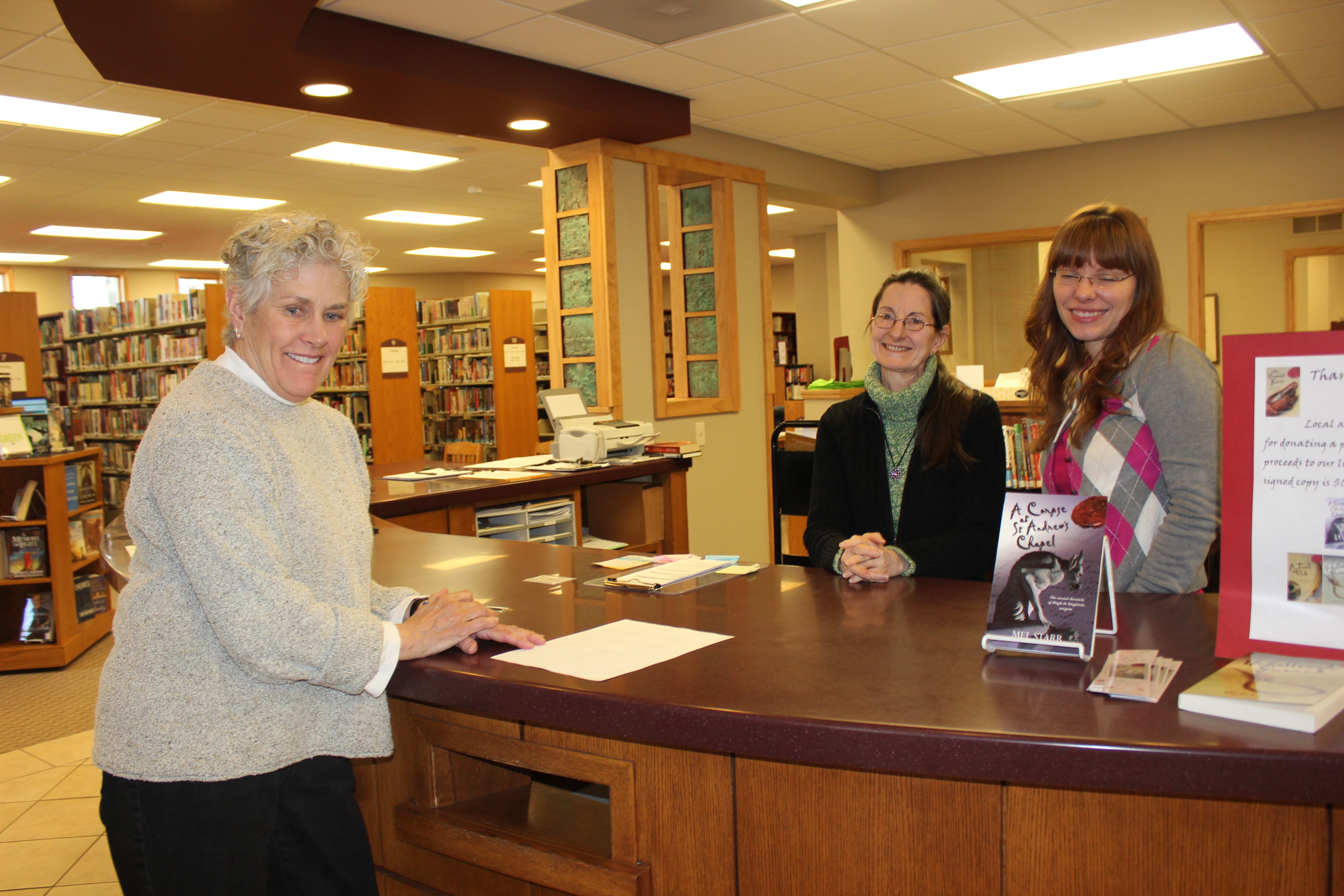 Schoolcraft librarians greet people at the front desk from left to right: Susan Harper-Grieger, Roxanne Wilkins and Faye VanRavensway.