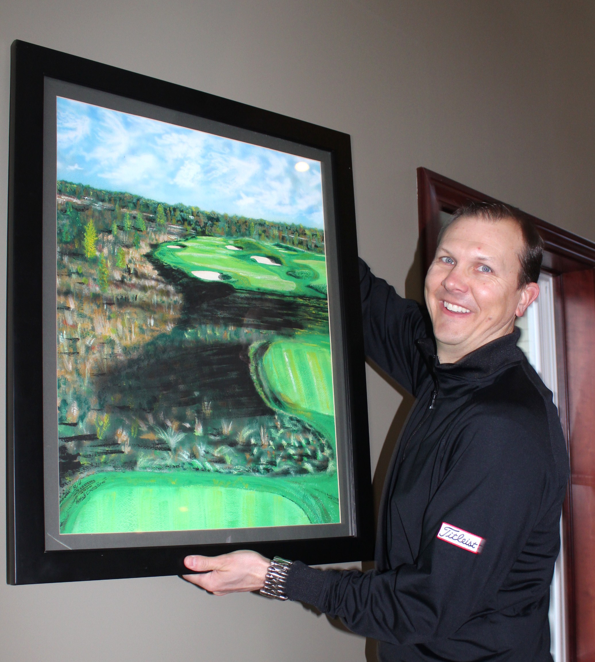 Jeff Rohrstaff, Angels Crossing pro, is proud of a painting given to the golf course by Bill Sanders, who lives on Barton Lake. He has hung it in the great room for all to see the beauty of the 18th fairway and green from an overhead angle.