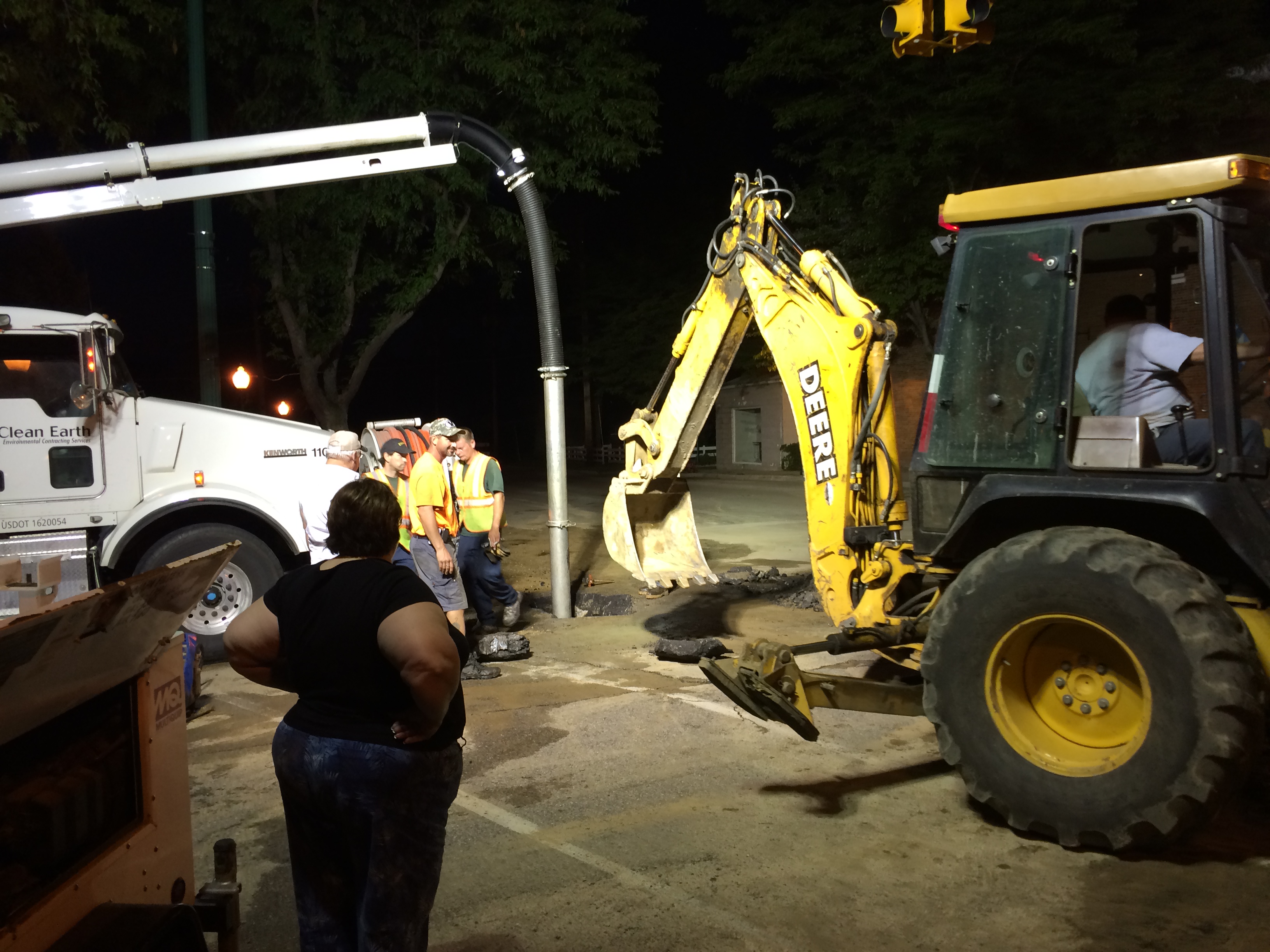 The water main that burst in downtown Vicksburg on Sunday, July 15 sent a river of water down West Prairie Street, while the Department of Public Works staff, hastened to stop the flood.