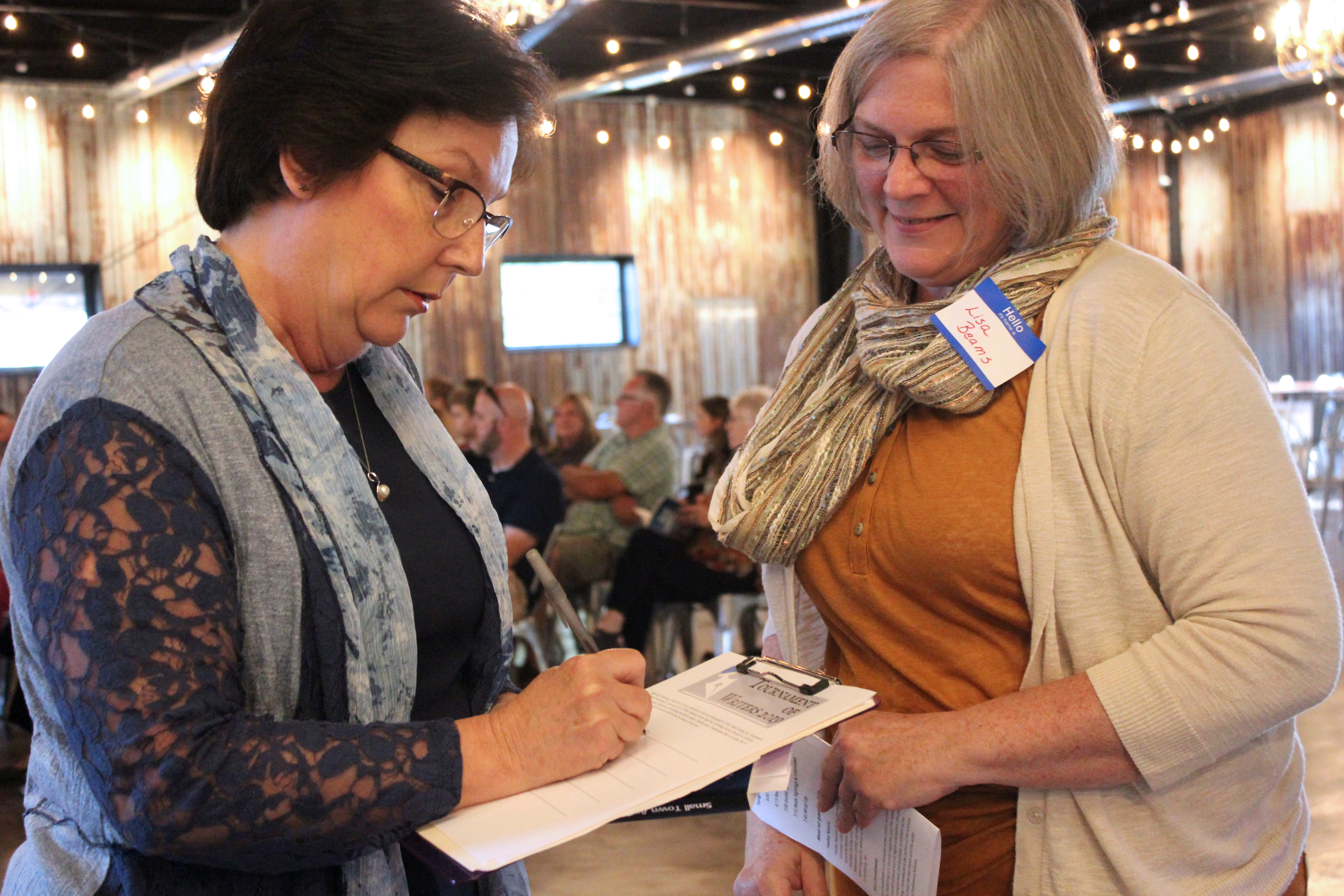 - Carol Braymer, first prize winner in the Senior Poem category, signs in at the Tournament of Writers celebration with Lisa Beams on the right.