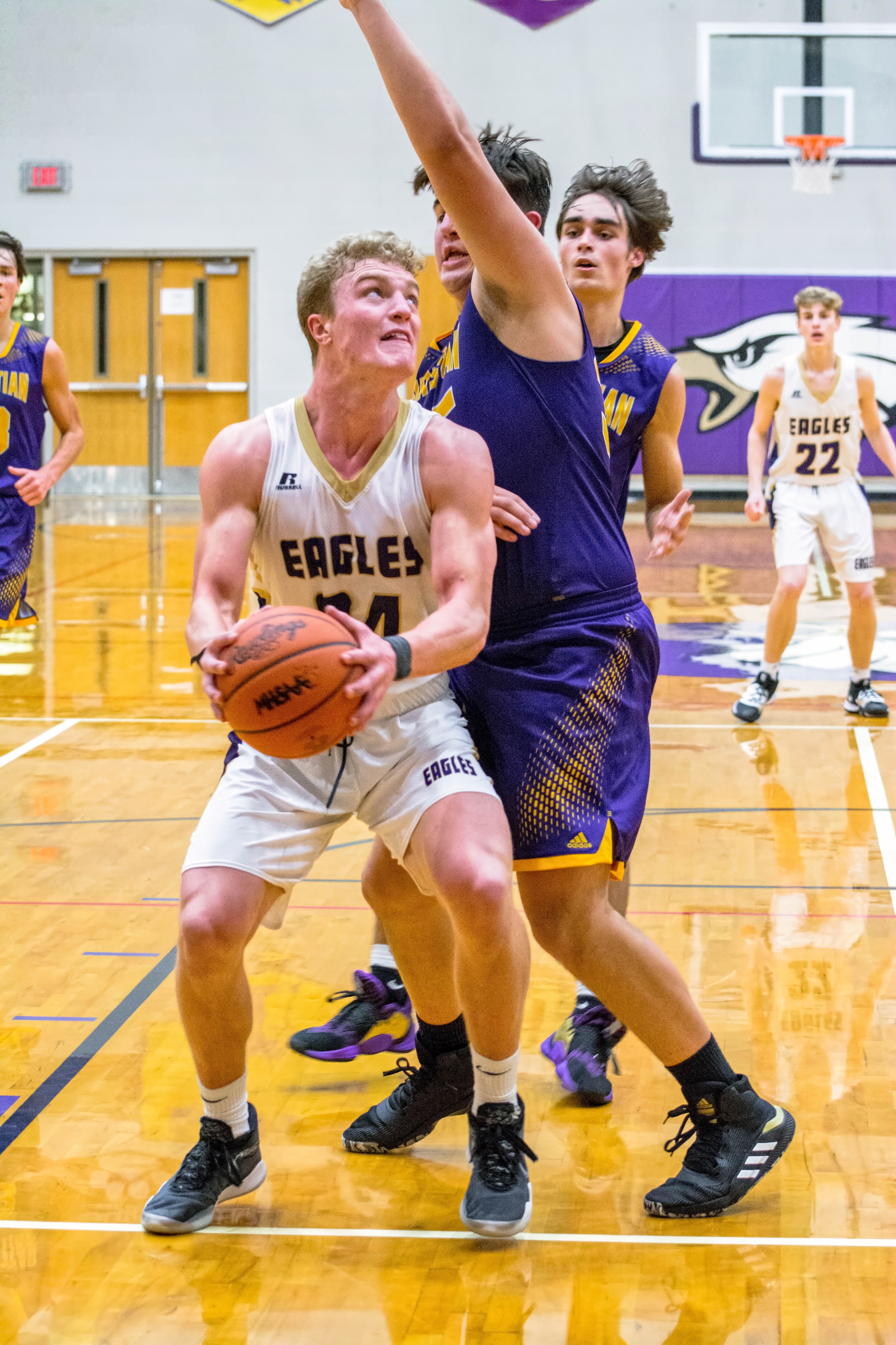 - Schoolcraft’s Trevor DeGroote, closely guarded by a Kalamazoo Christian player, looks to shoot. Jonny Abel, number 22, trails the play. Photo by Stephanie Blentlinger, Lingering Memories Photography.