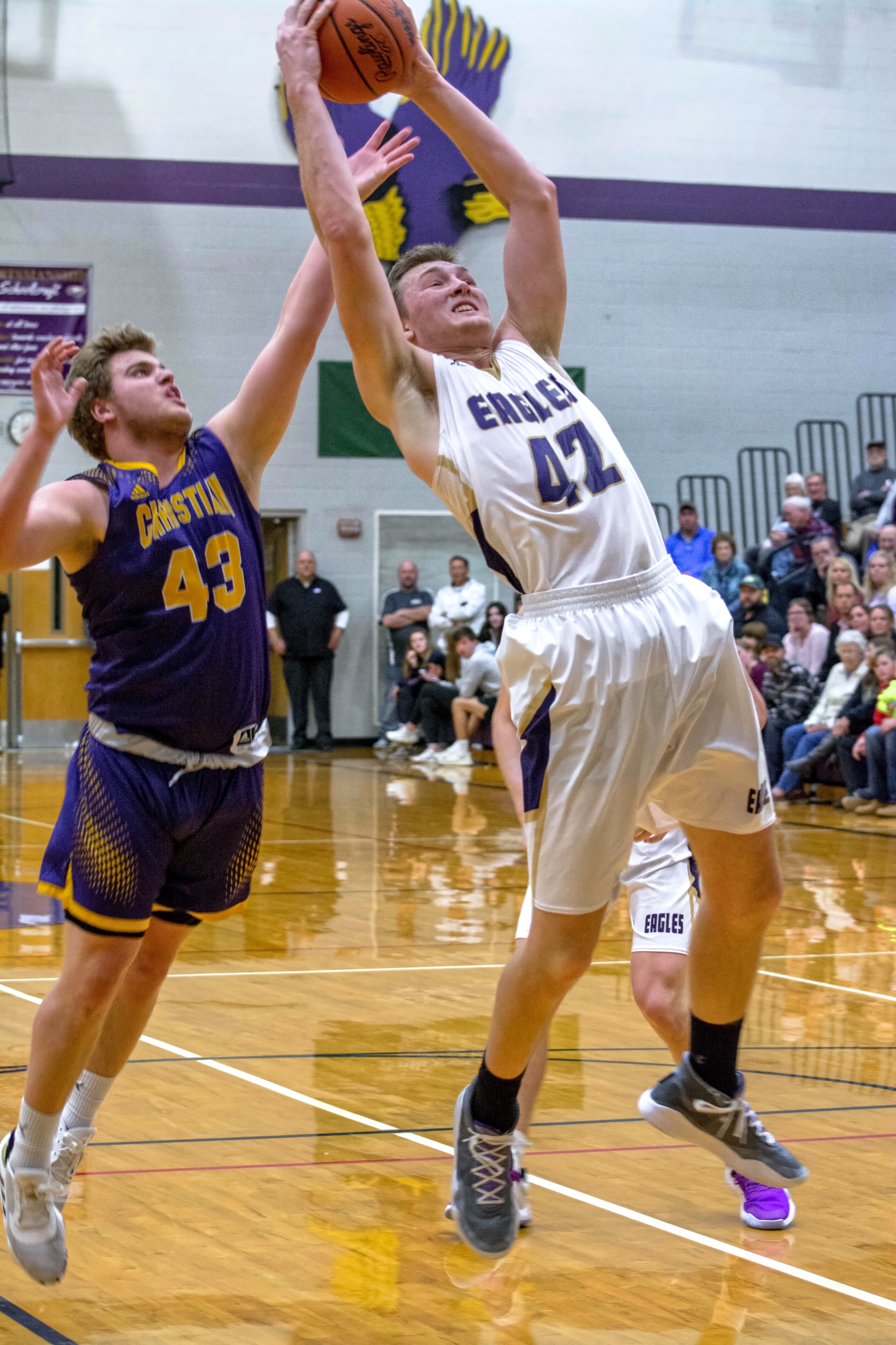 - Bryce VanderWiere goes up high for a rebound. Photo by Stephanie Blentlinger, Lingering Memories Photography.