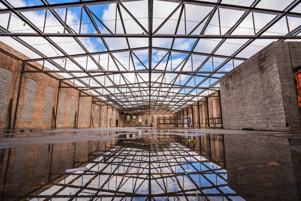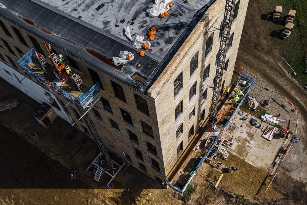 Despite COVID challenges, projects at the Mill remain close to schedule. Masonry work continues, as do lead abatement – paint removal – and roofing. Jackie Koney, the Mill’s chief operating officer, anticipates masonry should be done by the end of this year. She remains hopeful that lead abatement will be complete in the late spring. Even though the masonry and roofing had to stop for a bit with COVID, the contractors have been able to make up some of the time. COVID rules allowed lead abatement to continue because of special permission from the State. The photographs, taken by Taylor Kallio of Alterra Media, help to capture the size and scale of the roofing project.