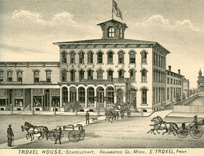 In the early 1870’s, plans were drawn up to erect a new three-story brick building in place of the Schoolcraft House wooden structure, and move the existing wood-framed building behind it to serve as a dining room and kitchen; with the upper floor being turned into a ballroom. This building was to be named the “Troxel House” (later to be known as the “Commercial House”) and continued to house overnight travelers passing through the area.