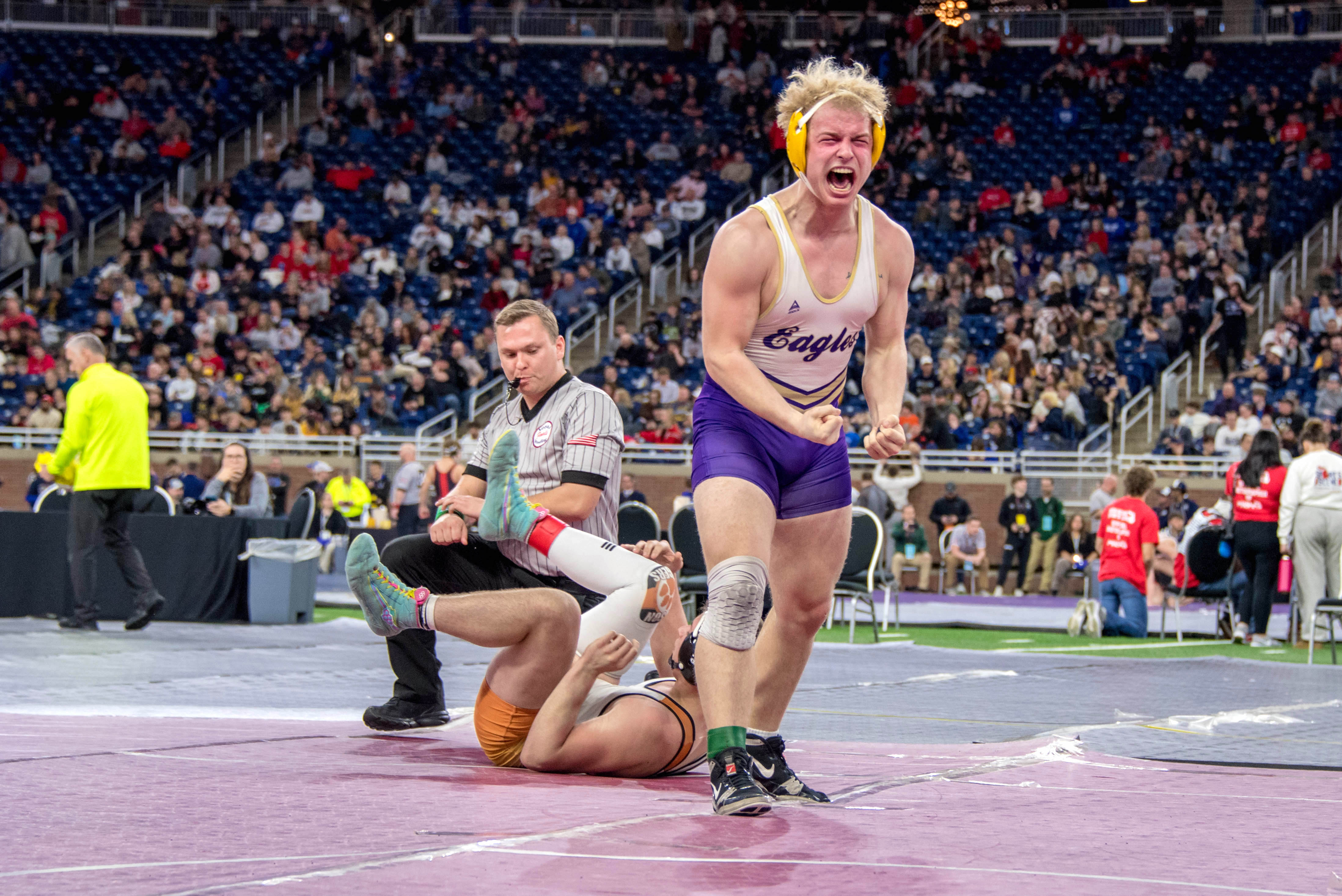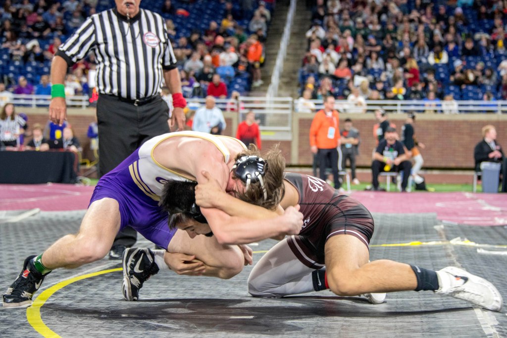 Five Schoolcraft wrestlers were among the 1,200 athletes at Ford Field on March 3 and 4, all trying for the top spot in 14 different weight classes. One of the 222 female wrestlers, junior Treasure Fox, competed in the 135-pound weight class. Her first match was against the eventual State runner up, Caylynn Chandler of Birch Run. Chandler won by pin at the 1:49 mark of the second period.