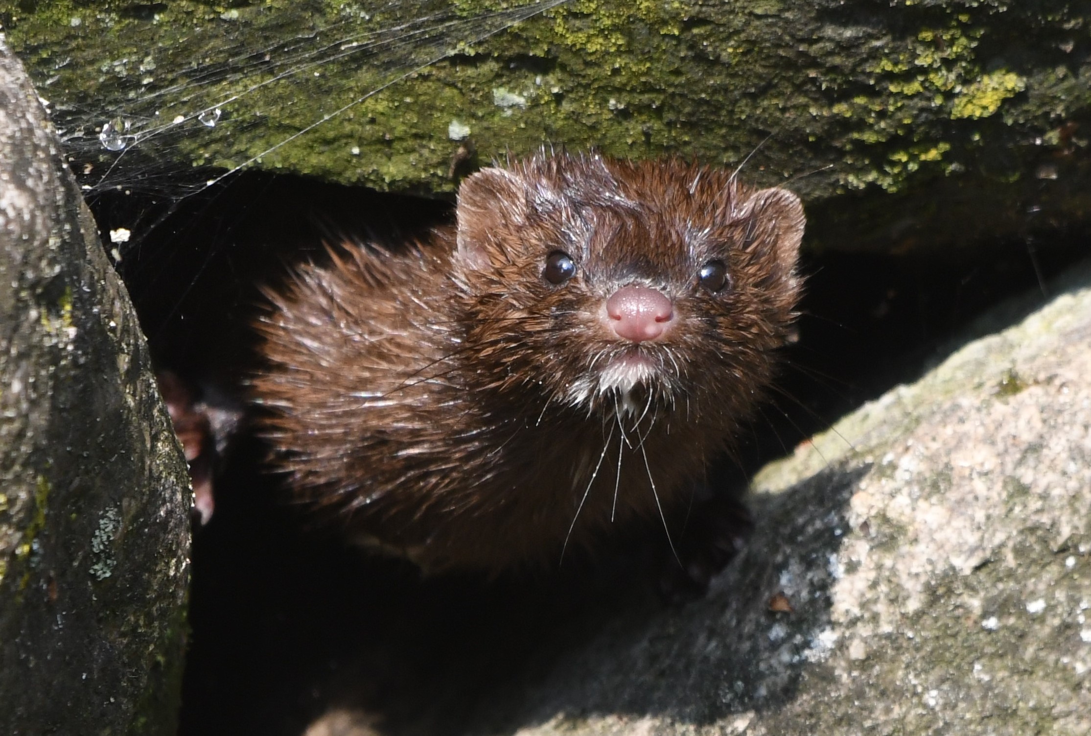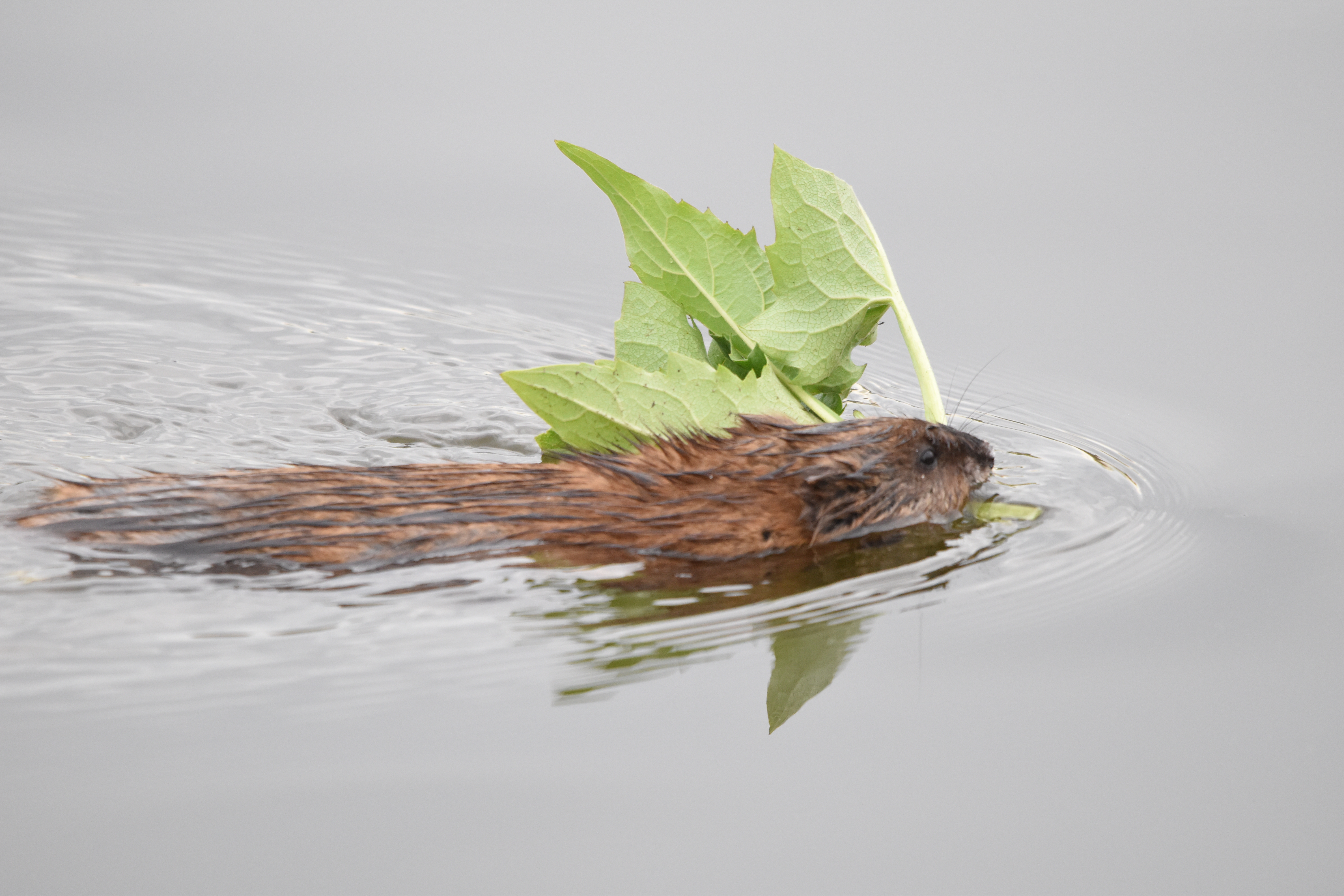 Mink and muskrats have almost identical body lengths (1-2 feet), so they look very similar when swimming, but mink have much darker fur than muskrats. It’s a rich, chocolatey brown and looks almost black when wet. A muskrat’s fur is lighter. Mink are also more streamlined than muskrats, and have smaller heads. If you’re lucky enough to see the tail of a mink or muskrat as it swims by, identification should be a dead giveaway. A mink’s tail is slender and furry while a muskrat’s tail is thin and hairless (just like a rat’s). Sometimes, when muskrats are swimming, their tail will be arched slightly out of the water, or even pointed upward like an antenna, making identification a slam dunk! Also, if you can see what they’re carrying in their mouths, you’ll have another great clue. Muskrats often swim with plants protruding from their mouth, like leaves, cattails, and water lilies. They are mainly plant eaters. Mink, on the other hand, are not! They might have a fish, but never a plant!