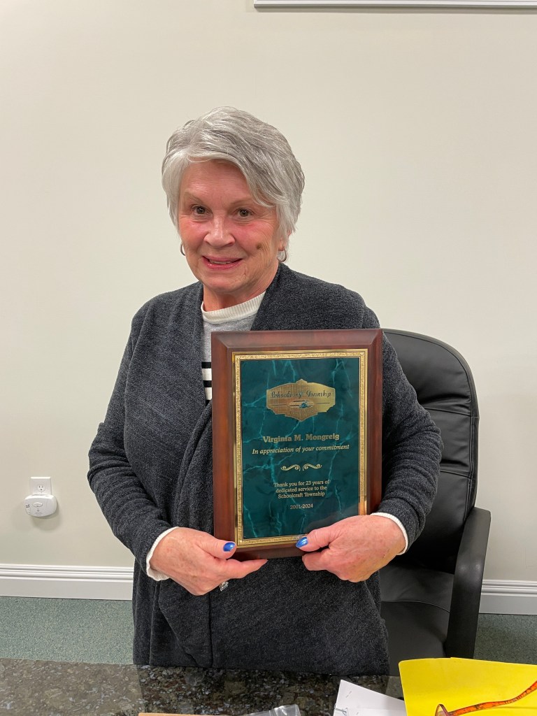 Retiring Schoolcraft Township Clerk Virginia Mongrieg was honored at the township board meeting on November 12. Mongrieg served as township clerk for 20 years but has been employed by the Township for 23 years.