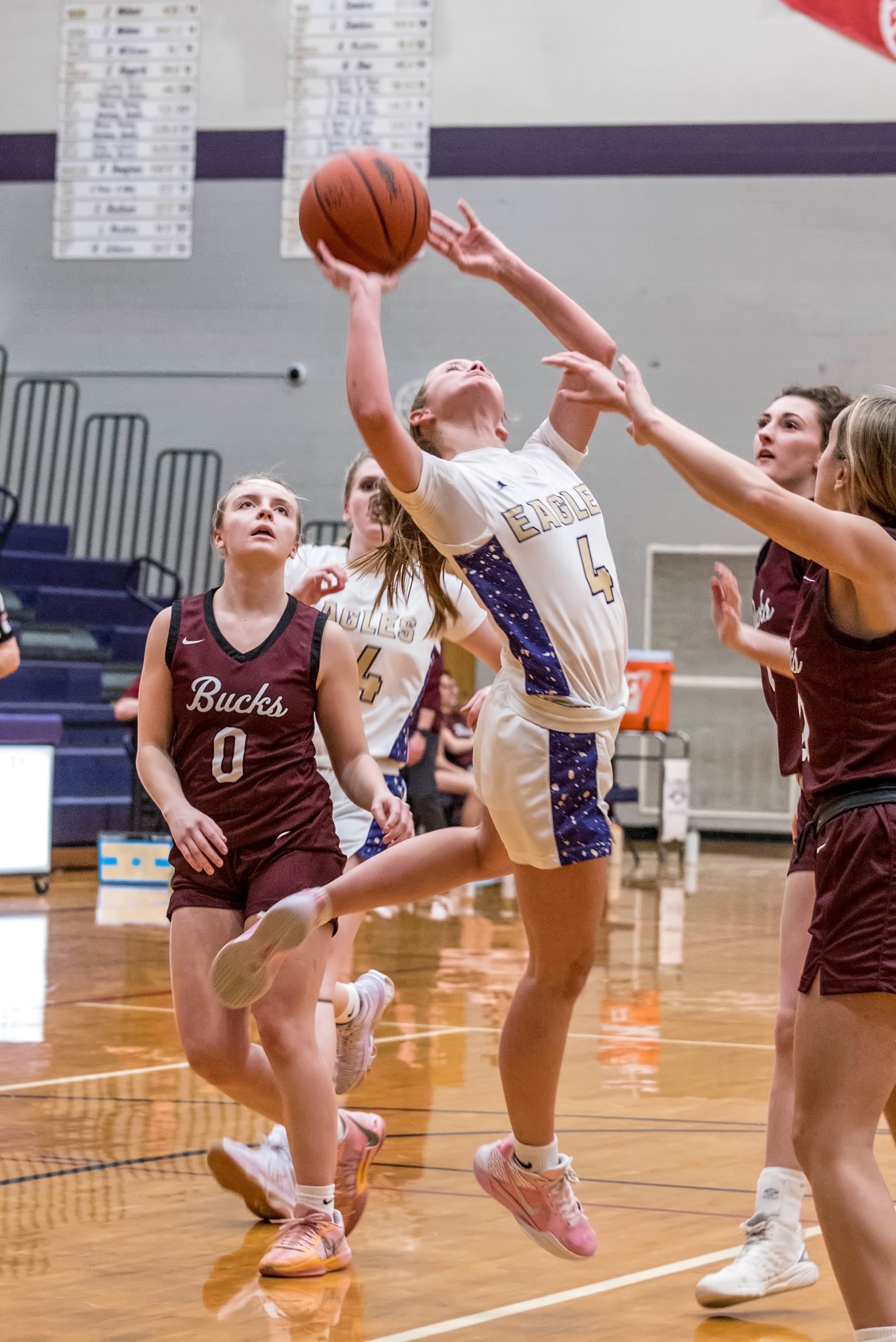 The Bucks opened with a 10-0 lead until Carley Couk scored on a 2-point jump shot and Sydney Drenth found openings and drained 2 long 3-point shots just outside the paint. The visitors led 15-7. The Bucks played strong defense, anticipating and blocking multiple passes. At the half, the visitors led, 27-14.