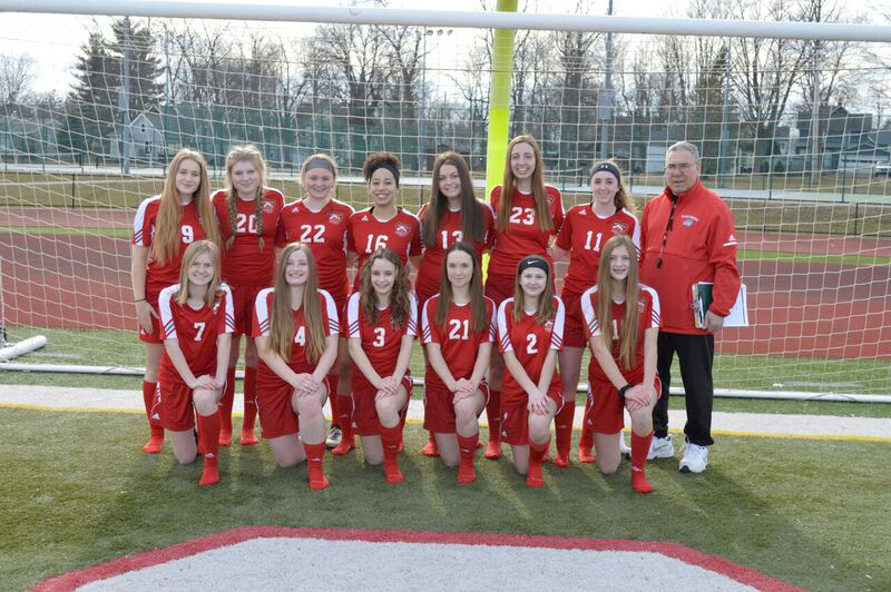 Varsity Soccer First row, from left: Dawnara Rollins, Abby Martin, Haley Town, Hailey McConnaghy, Leah Johnson. Second row, from left: Ellie Lancaster, Hailey Burr, Emmaline Miller, Claire Martin, Sydney Martin, Megan Piper, Riley Sibley. Third row, from left: Coach Mike Moldovan, Chloe Hatridge, Morgan Snook, Brady Brown, Alaina Wurfel, Assistant Coach John Cook. Photo by Lisa Harbour.