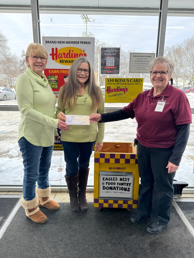 With the help of local shoppers and the Schoolcraft community, this year’s drive provided over $4,000 to support the local food pantry. Receiving the check are Cheryl Riekena and Ruth Garrett, two retirees who once a month pack about 35 grocery bags of food for senior citizens. They also shelve and organize food and help keep the Eagles Nest clean.