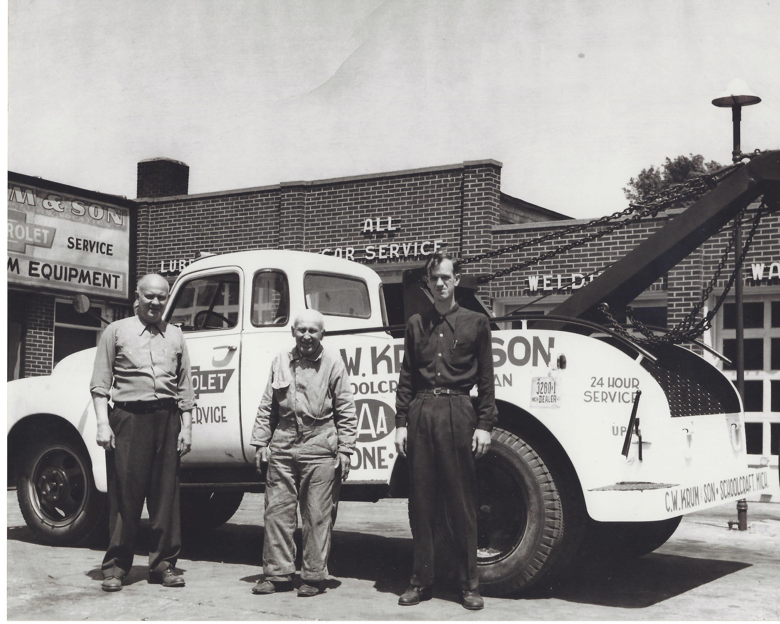 Something that probably few people today know is that in 1930 the Krums also became a sales and service dealer for the Oliver Farm Equipment line of products for the local farming community as well. Also, the Krums had the foresight to address the developing need for dealing with the disposal of older, worn-out autos who have served their purpose or those which had been wrecked and were not repairable. So, in 1936 they established one of the first local salvage yards. And, let’s be honest, since the dawn of the motoring public, there have always been deer, trees, and other vehicles to collide with, so, the Krums also established a formal body shop that same year to repair vehicles which had suffered any of these fates.