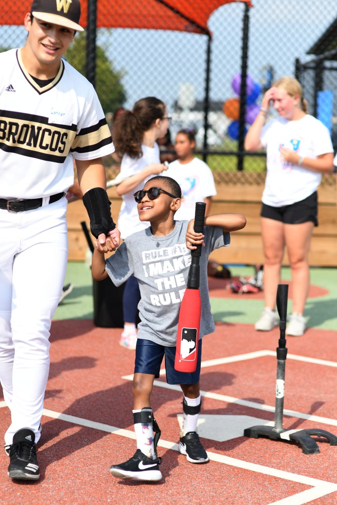 It’s open for kids from 5-19 to play regardless of abilities. The field has a flat rubberized surface to eliminate barriers to players using wheelchairs or who are visually impaired. Dugouts are wheelchair-accessible. Volunteers – “buddies” – work one-on-one with each player, helping them run or wheel around bases or helping them swing a bat.