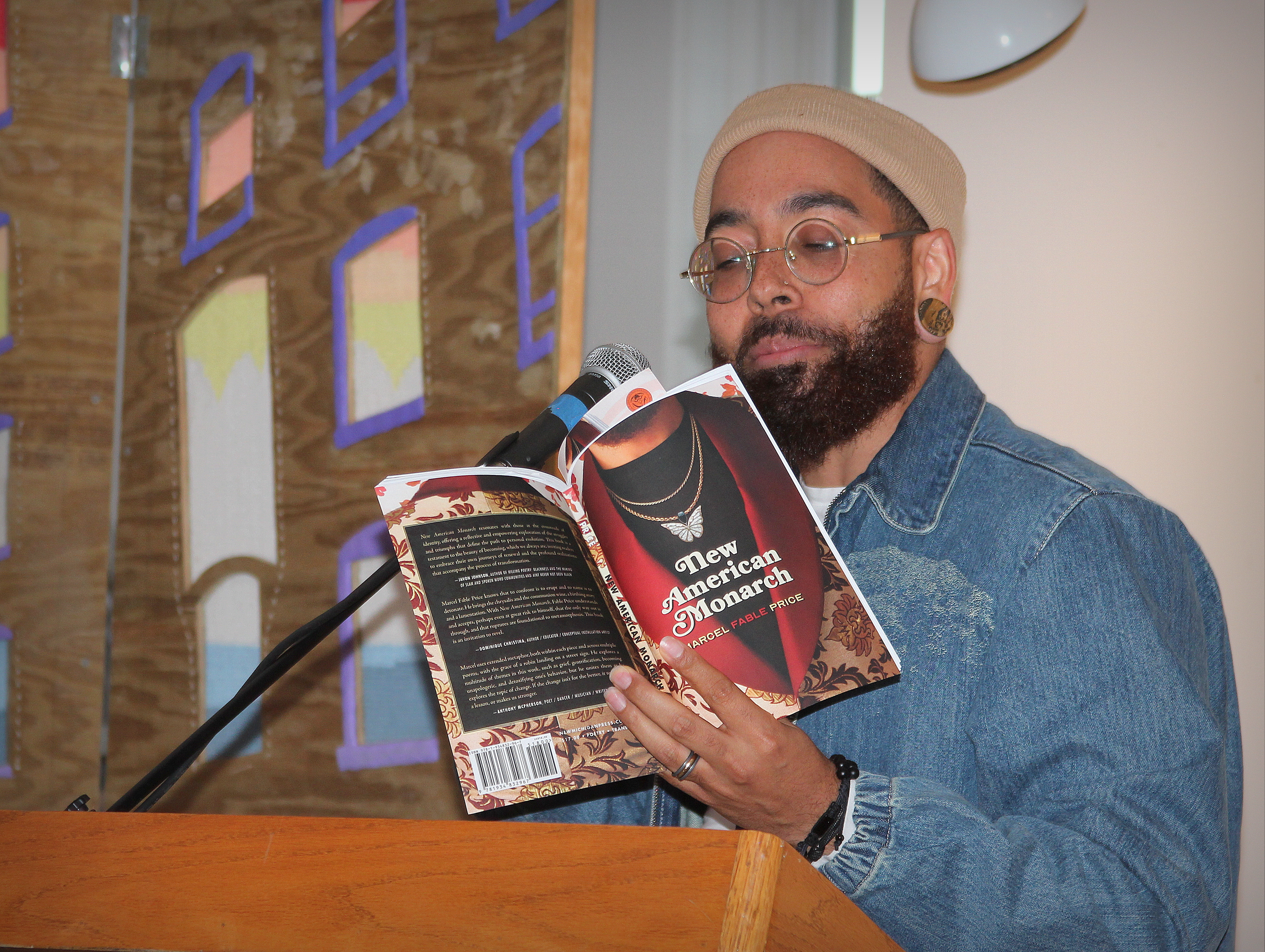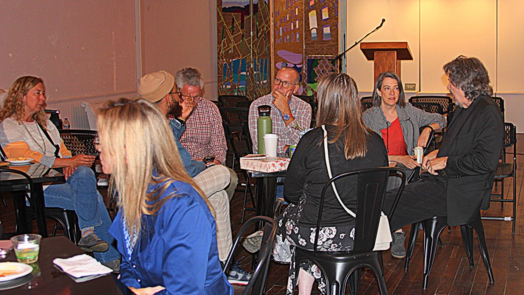 First in the line-up were two local writers, Nancy Hibiske-Reed and Ross Landers, who read their winning entries in the 2024 Tournament of Writers. Next, former Grand Rapids Poet Laureate Marcel “Fable” Price took the podium as emcee of the inaugural event with a brief reading from his newest poetry collection, “New American Monarch”. Fable then introduced the featured speaker, award-winning poet Richard Katrovas, a WMU professor and founder of the Prague Summer Writing Program. Katrovas, described by The New York Times as “tough, gritty, full of wonder,” read from his book “Off the Road: My Weird Childhood on American Highways”, then engaged the audience in discussion of “origin stories.”