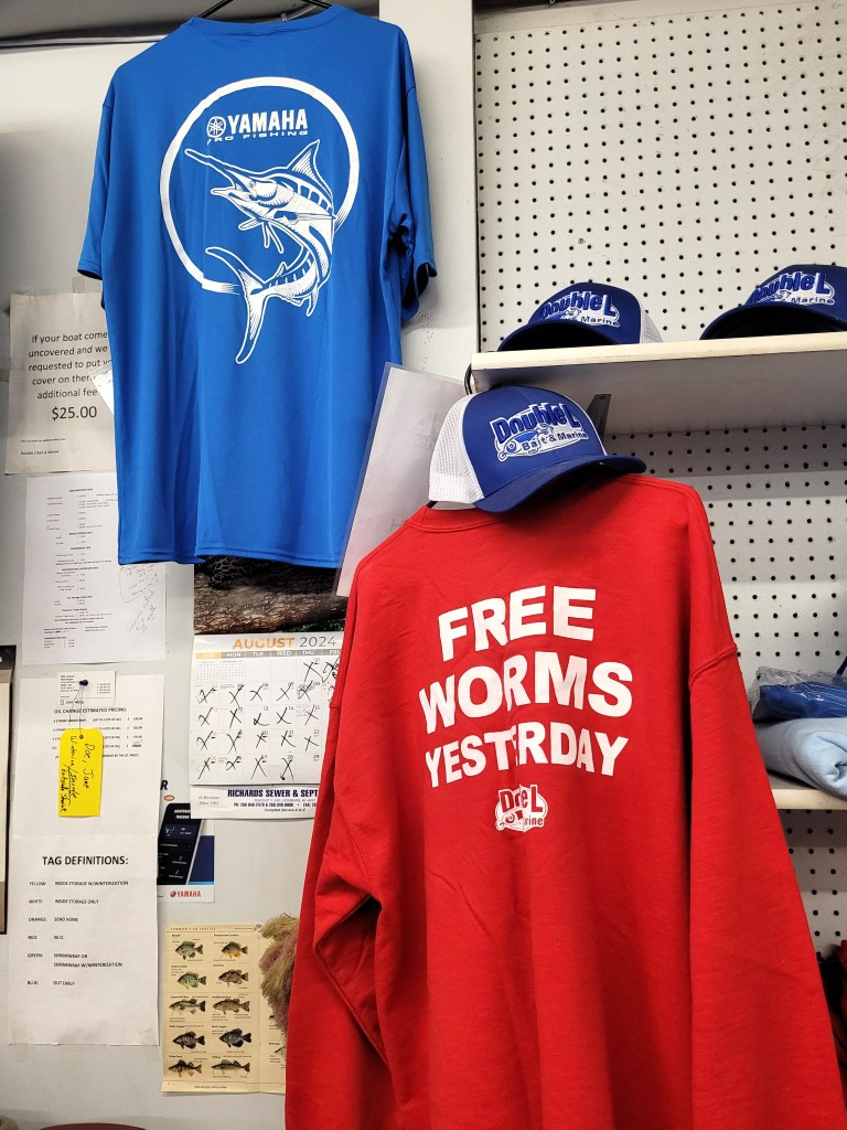 The bait and tackle section is well stocked with lures, live bait, poles and reels. You can purchase your fishing license there and get important information about fishing regulations and requirements in the state. There’s also an assortment of boat parts and accessories to include some used parts like props and the motors themselves. Firewood is available; so are cold drinks. Their “Free Worms Yesterday,” sweatshirts and tees, a local favorite, are available in different sizes and colors along with a good selection of other items including hats. Their boat sales include new and used, and brokerage sales. Pre-orders for live Christmas trees are also taken and LaCombe heads north to cut the trees to deliver them fresh cut to his holiday customers.