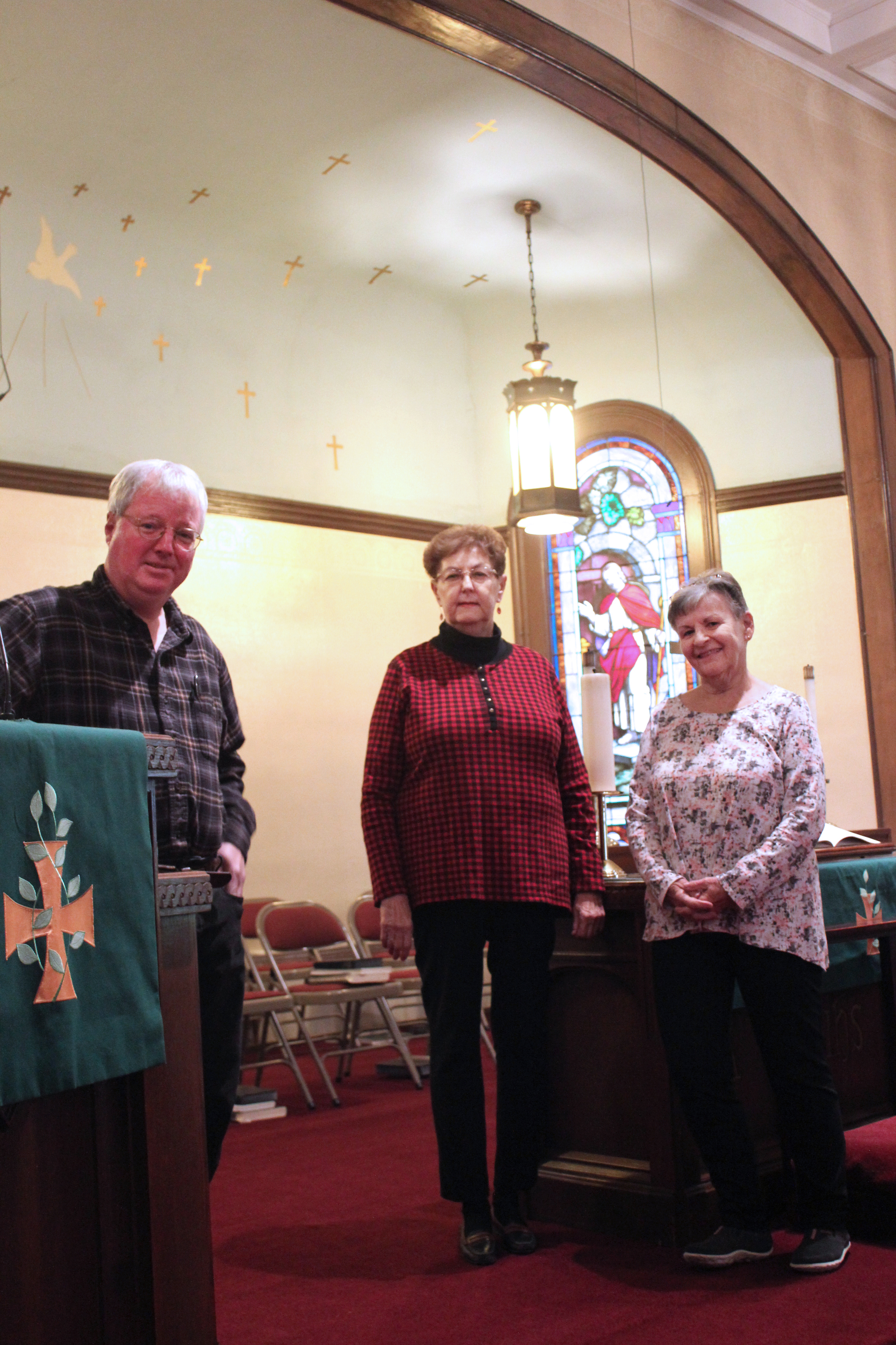 Pastor Greg Culver at the pulpit of the historic sanctuary in the Vicksburg United Methodist Church. To his side are the anniversary celebration co-chairs Aileen Greanya and Vera Walker.