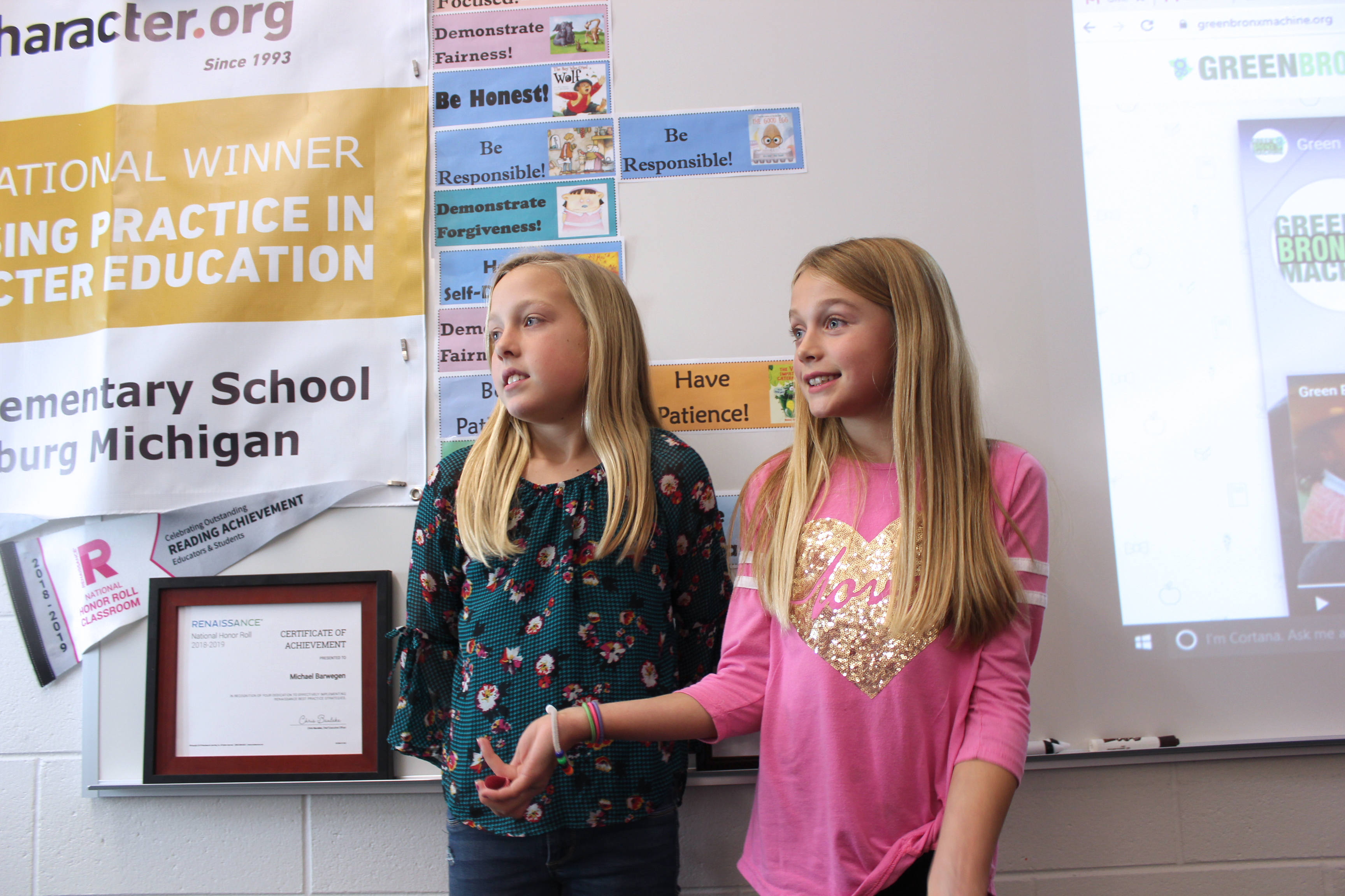 Camryn Rosier and Sophia Martin, students at Tobey, explain to the School Board about the traits it takes to be a National School of Character.