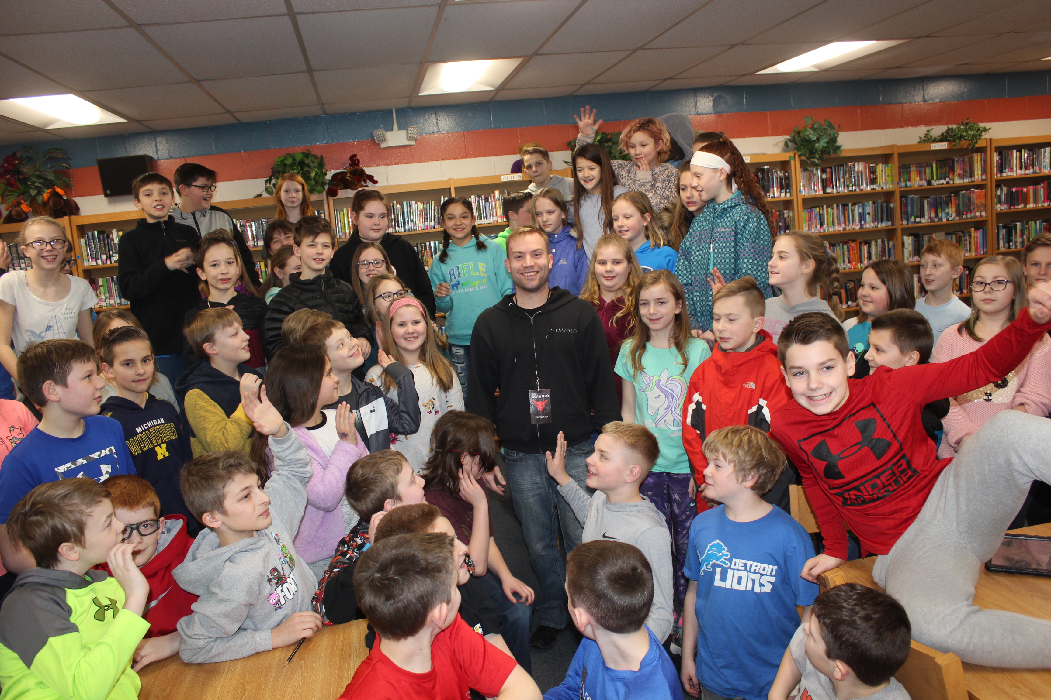 Schoolcraft fifth grade students crowd around Matt Wagner, a member of the Diavolo troupe that performed at Miller Auditorium in February. He grew up living on Barton Lake in Vicksburg.