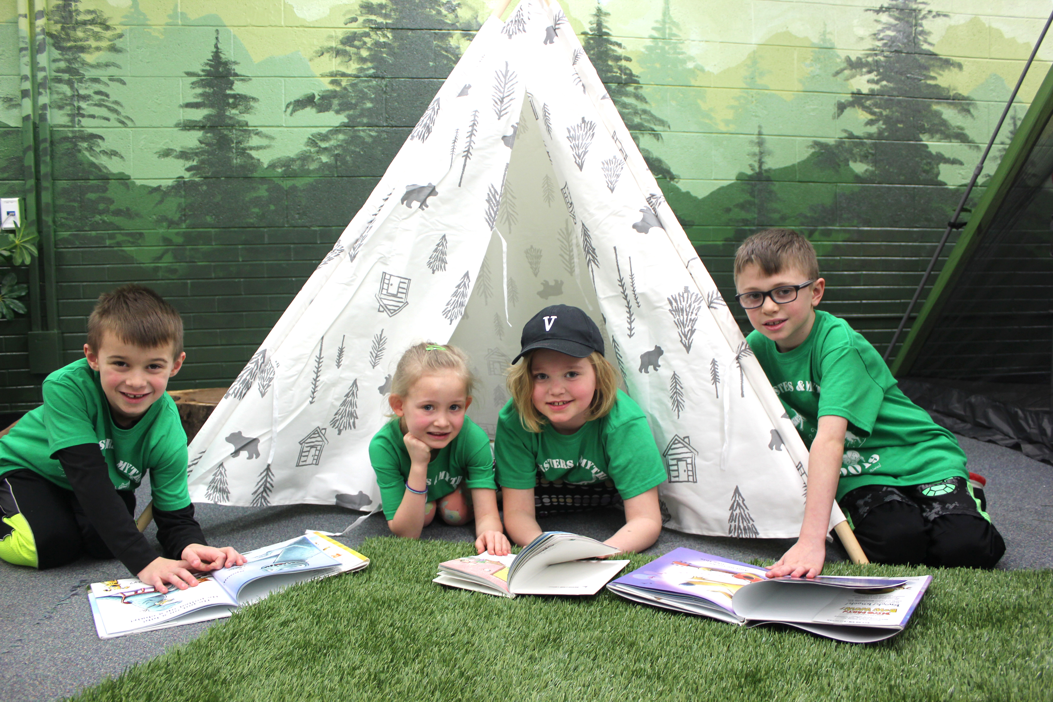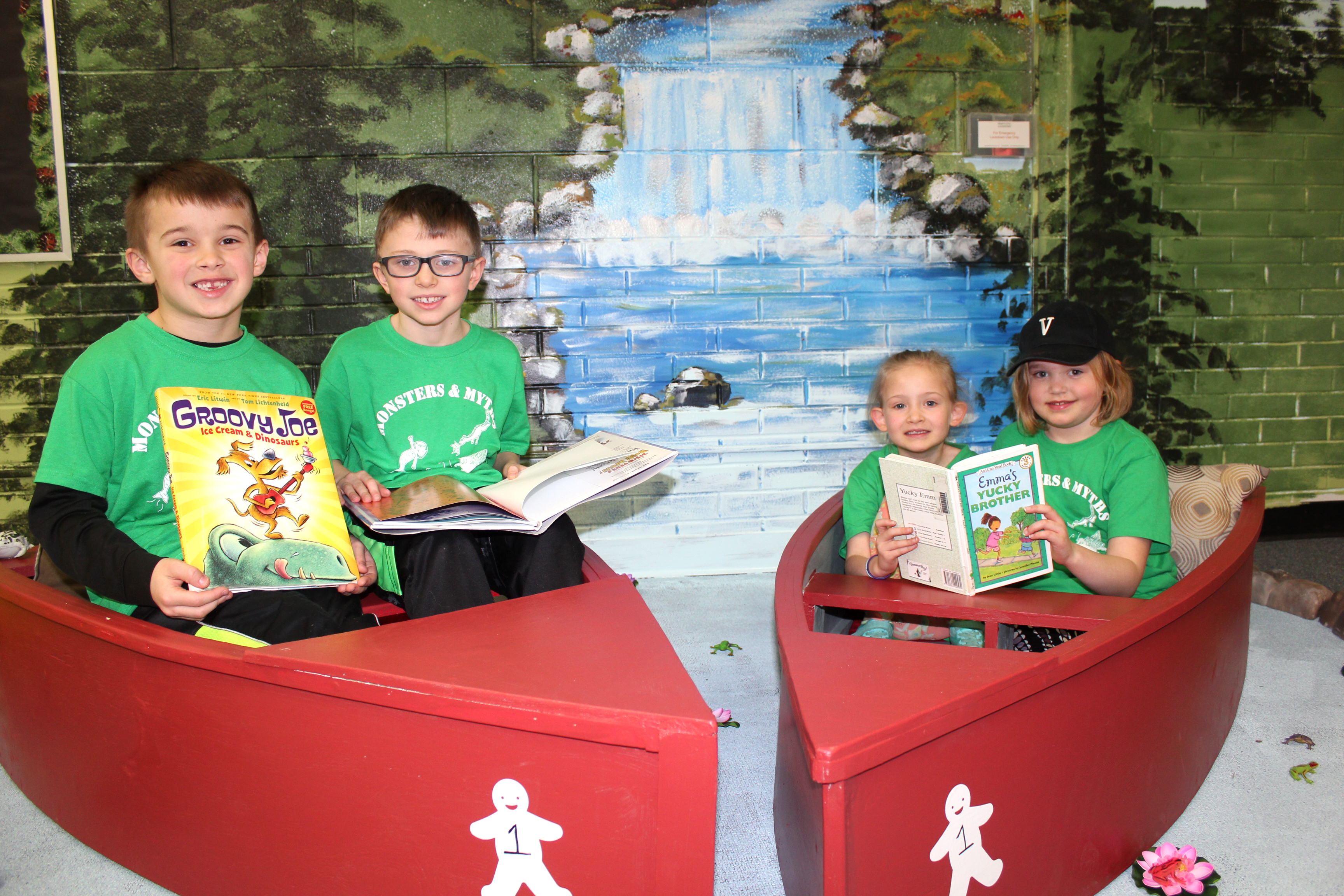 They can also choose to read in rowboats, traveling down an imaginary river. They are shown from left to right: Mason Keiser, Brighton Frakes, Quinley Lash, and Emelia Shafer.