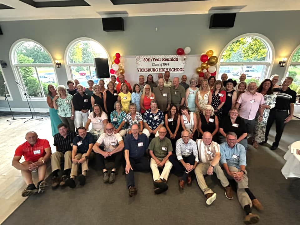On July 26 and 27, the Vicksburg High School class of 1974 held its 50-year class reunion. Because it was scheduled to coincide with the Lions Club B&B Festival, the class was able to make it a two-day event. Friday’s events included a golf scramble at Indian Run Golf Club, a Mill tour, and an evening reunion at Indian Run Golf Club. On Saturday, the events included pickle ball at Kline’s Resort, the Lions Club Alumni luncheon, a Vicksburg downtown crawl, and music and dancing at the B&B Festival.